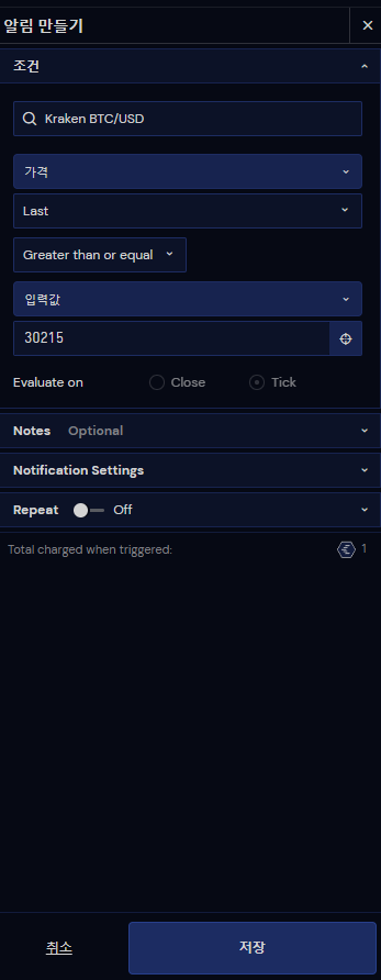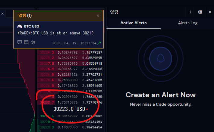 글을 작성하는 중에 비트코인 시세가 조금 움직여서 현재가 30213.8 달러가 되었습니다. 목표가 알림을 30215로 만들어보겠습니다.
